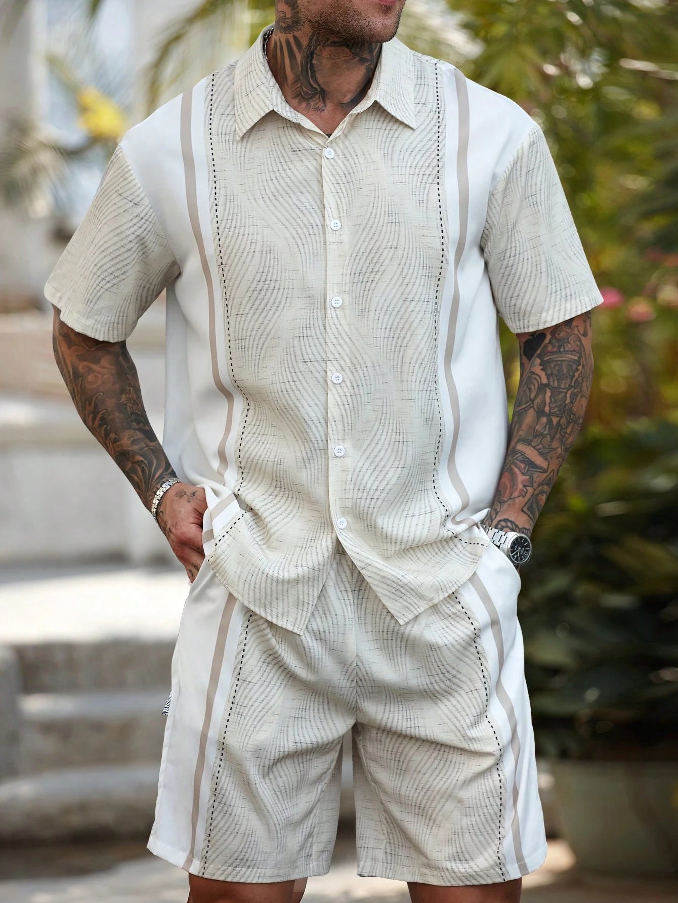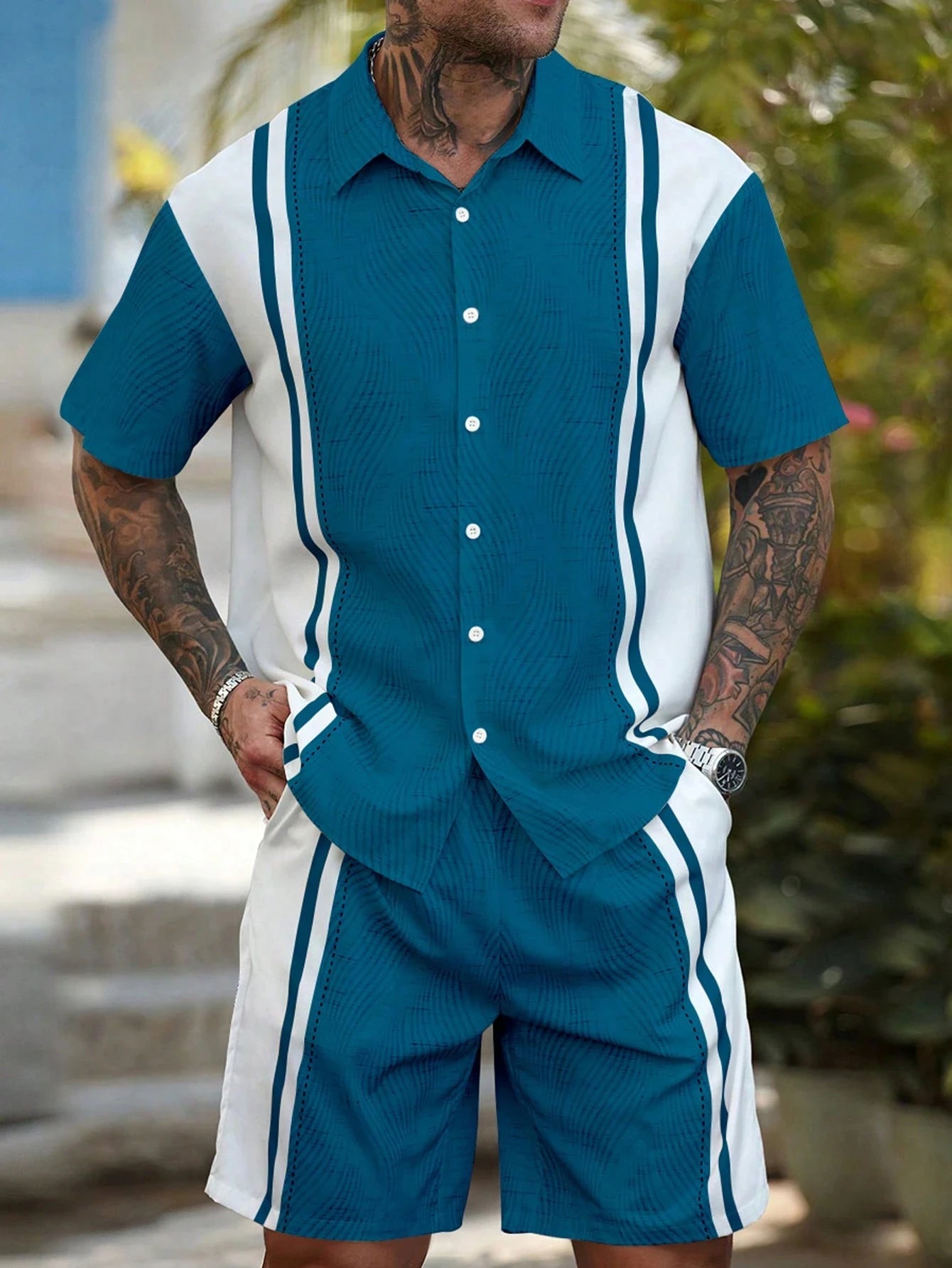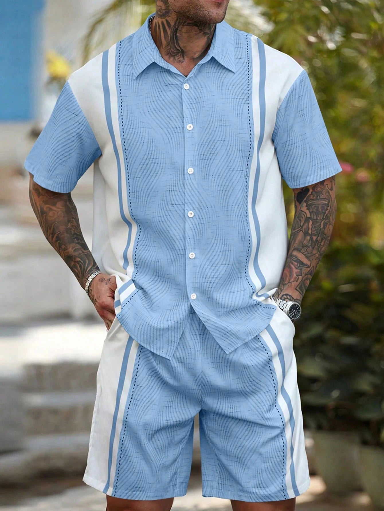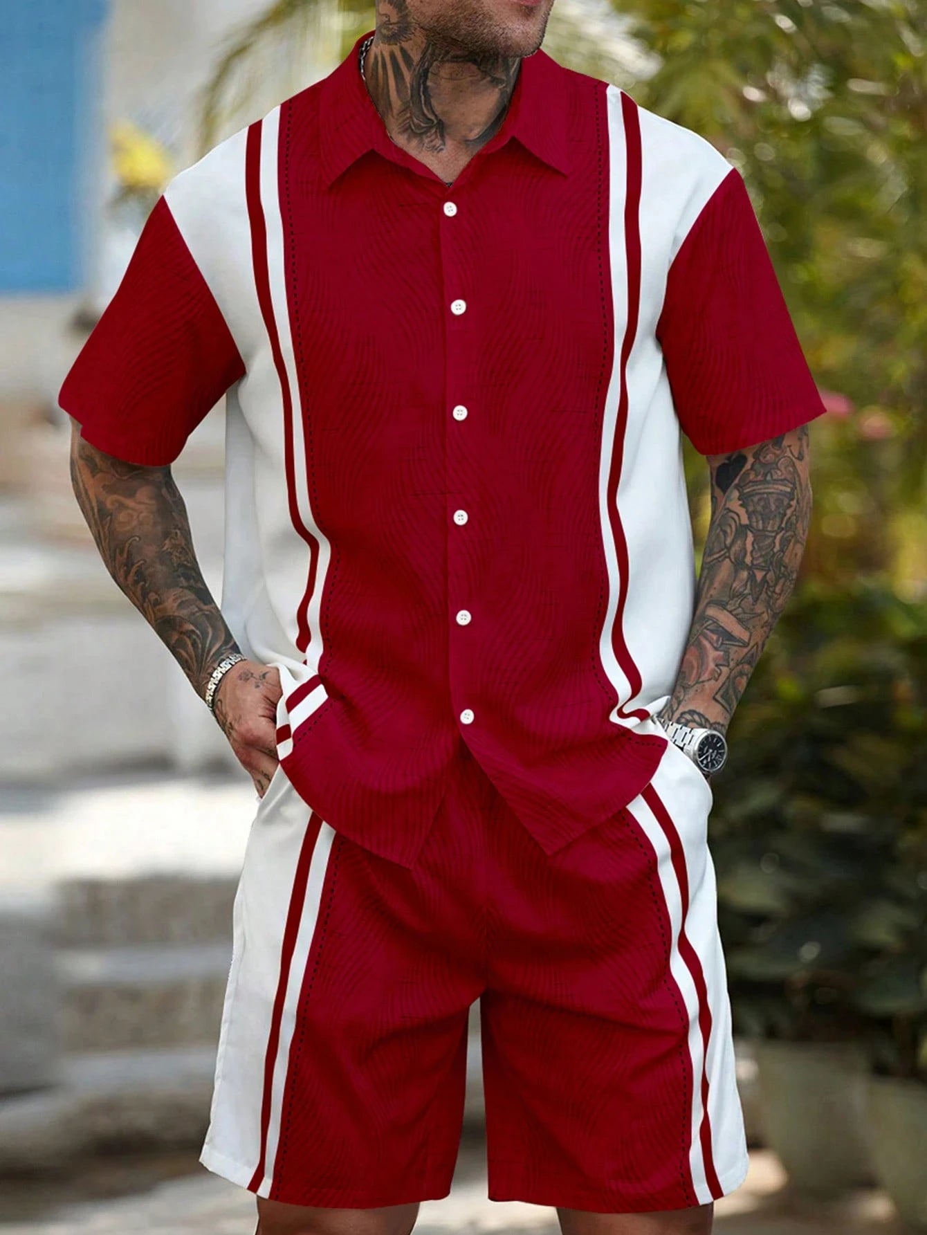 Ensemble homme chemise et short à rayures simples style hawaïen – tenue décontractée deux pièces pour vacances, chemise à manches courtes avec boutons.