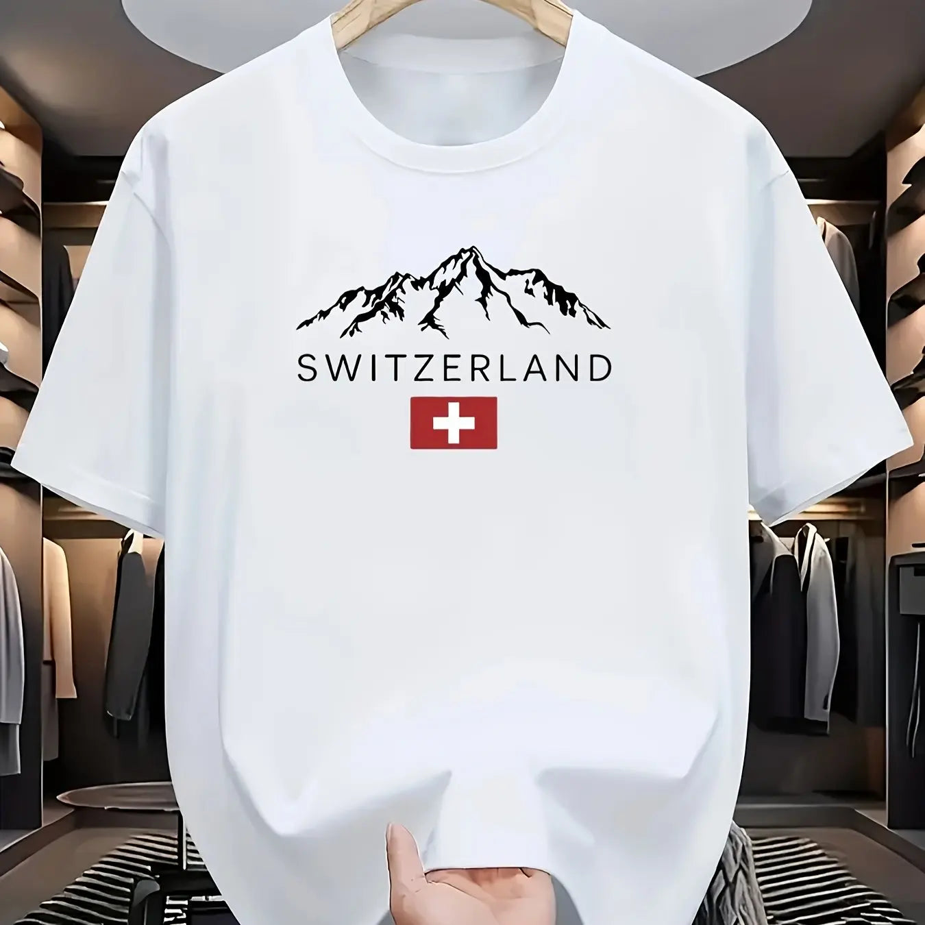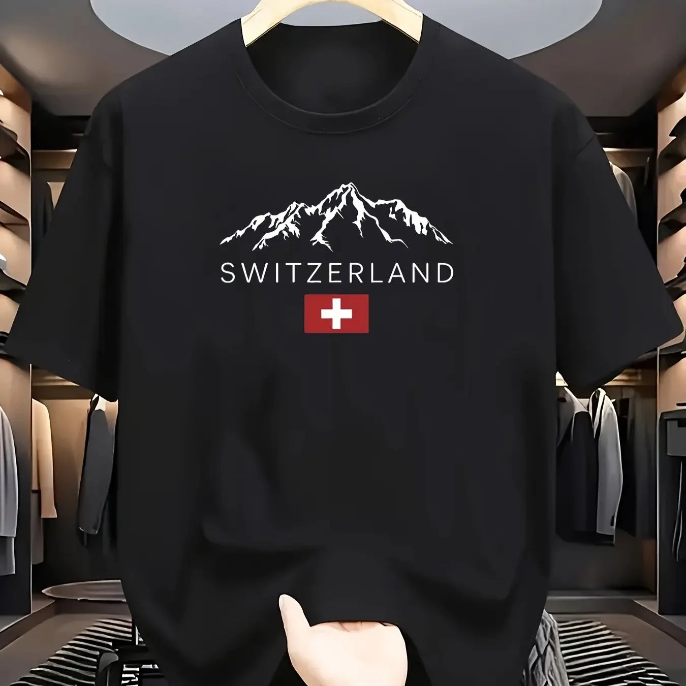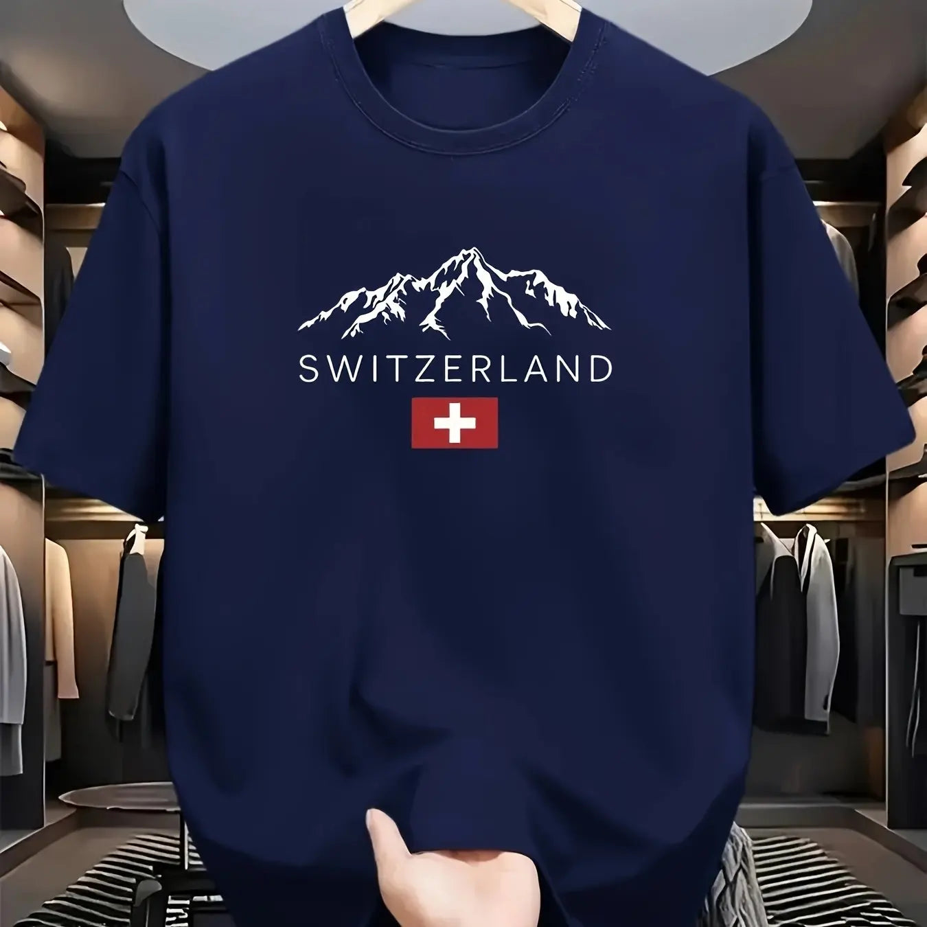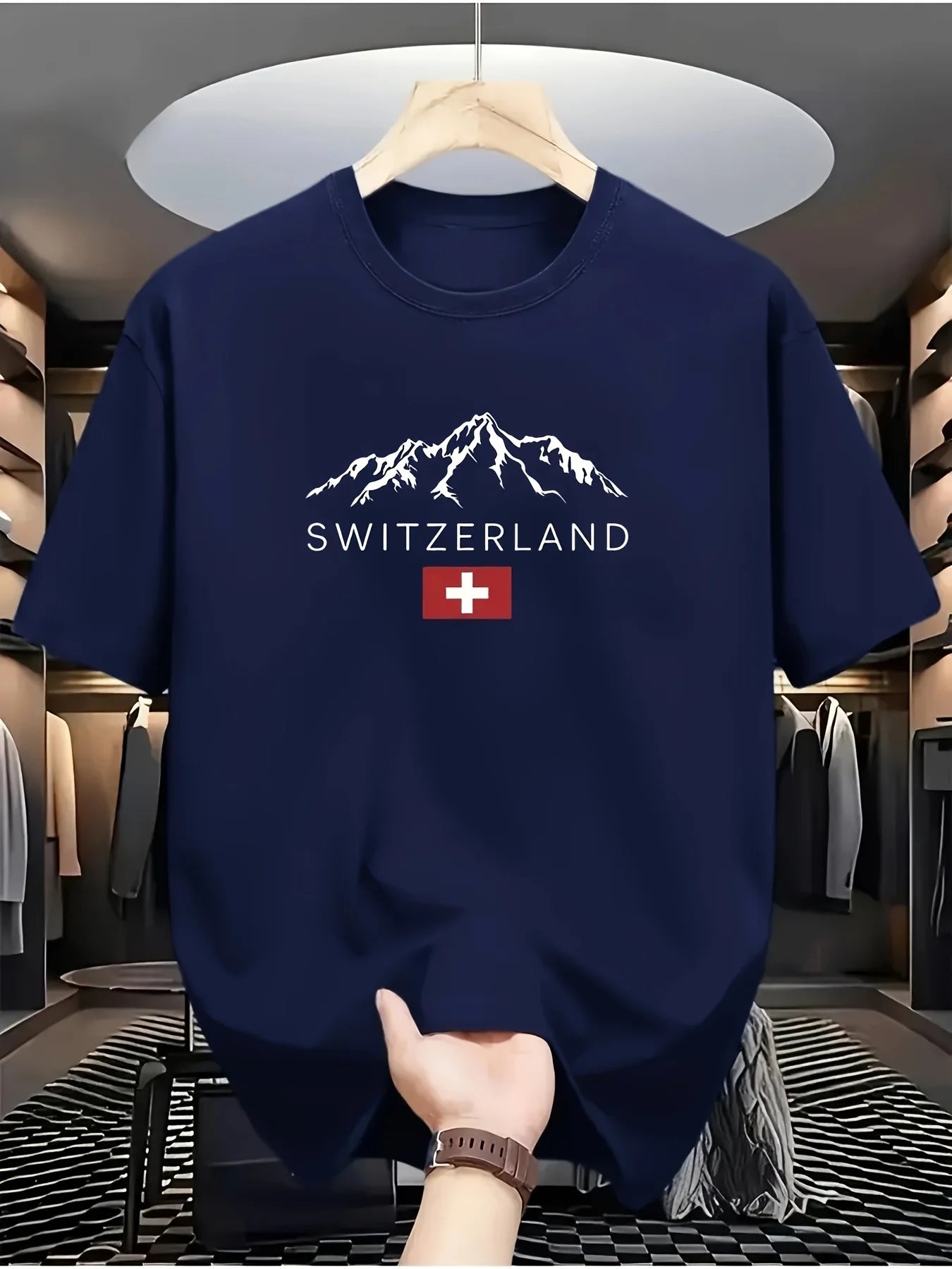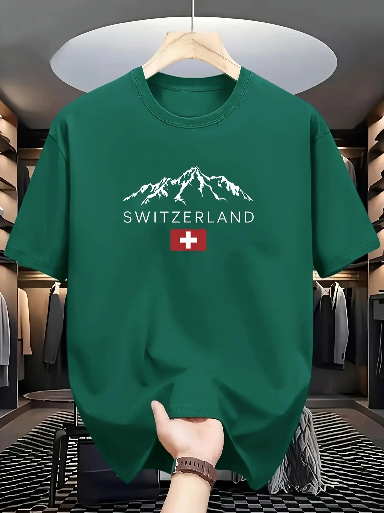 Men's summer 100% cotton fashionable casual loose sports Swiss mountain pattern printed round neck short sleeved T-shirt top